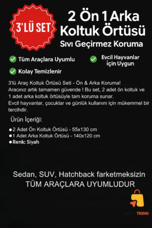 3’lü Oto Koltuk Kılıfı Seti – Su Geçirmez Ön ve Arka Koltuk Koruyucu Örtü | Kedi Köpek ve Çocuk Uyumlu
